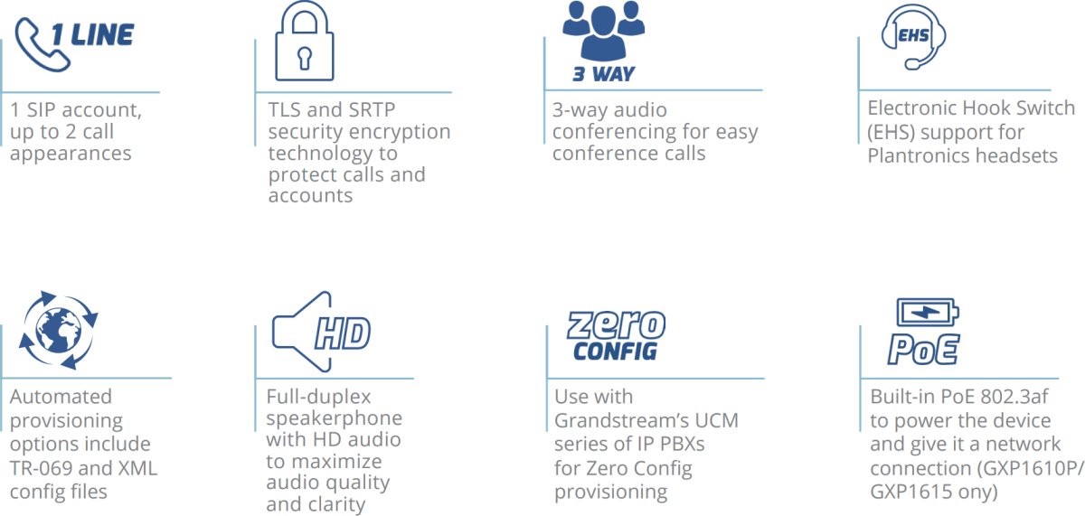 A simple IP phone for small business users, the GXP1610/GXP1610P/1615 delivers a user-friendly VoIP calling experience in a very easy-to-use IP phone. The GXP1610/ GXP1610P/1615 offers support for 1 line, 2 call appearances and includes 3-way voice conferencing to maximize productivity. Additional features include a 132x48 (2.95’’.) LCD screen for easy viewing, 3 XML programmable soft keys for customization, 10/100 mbps ports, EHS support for Plantronics headsets and multi-language support. These features allow the GXP1610/GXP1610P/GXP1615 to be a high-quality small business IP phone that is simple and easy-to-use.