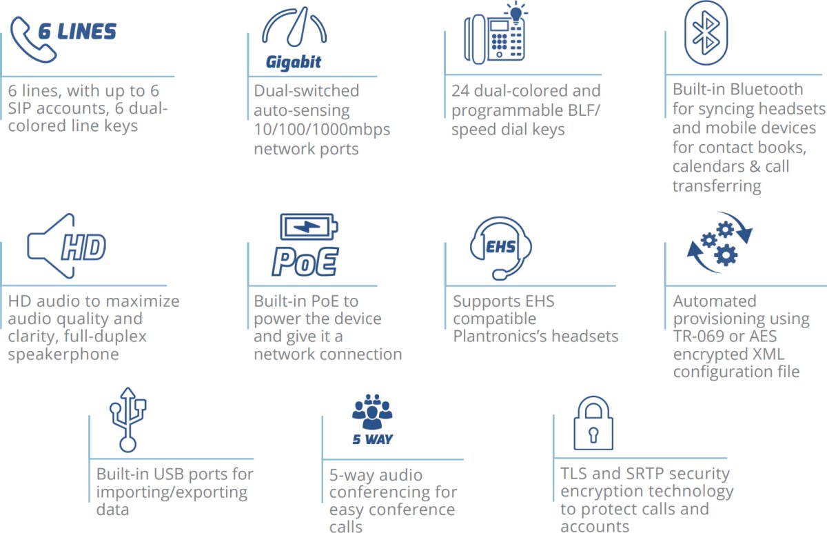 • Supports 6 lines, 6 SIP accounts and 5-way voice conferencing