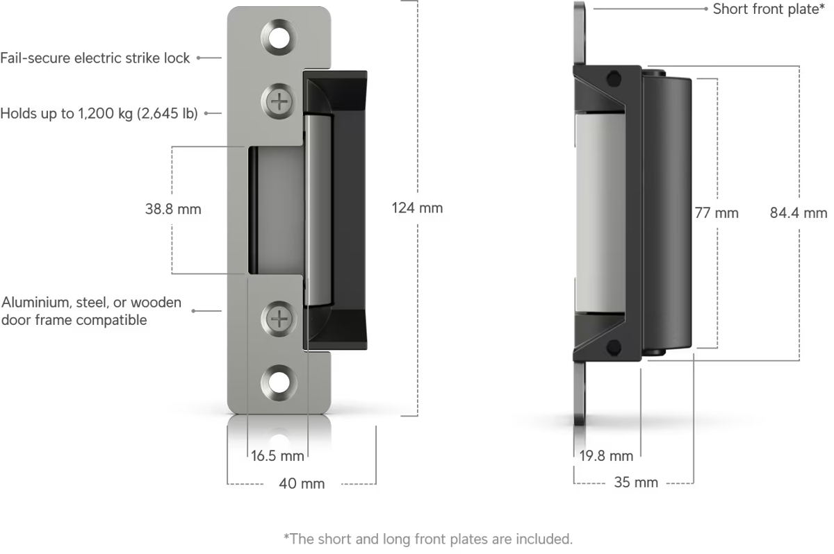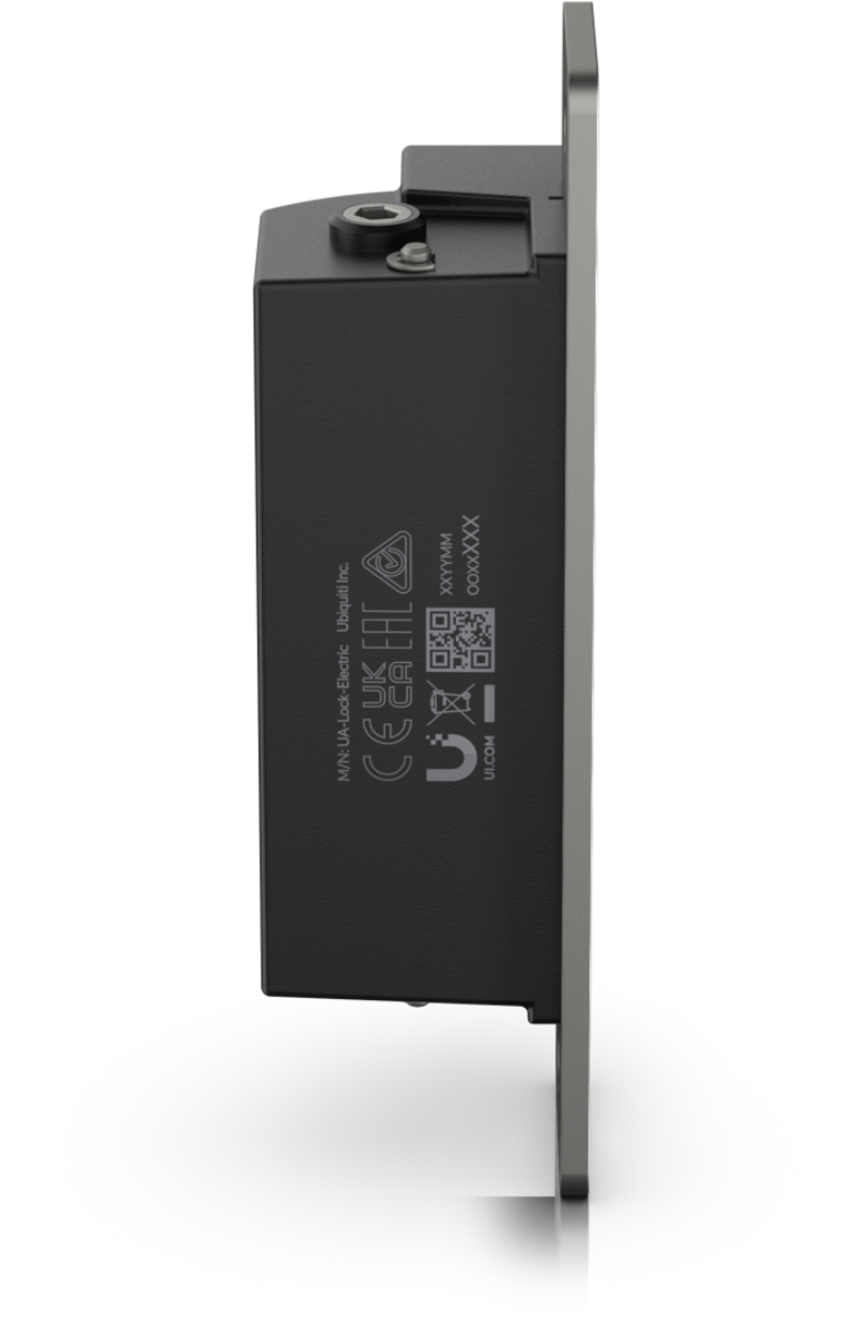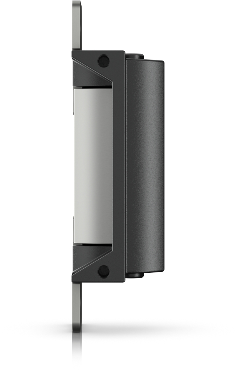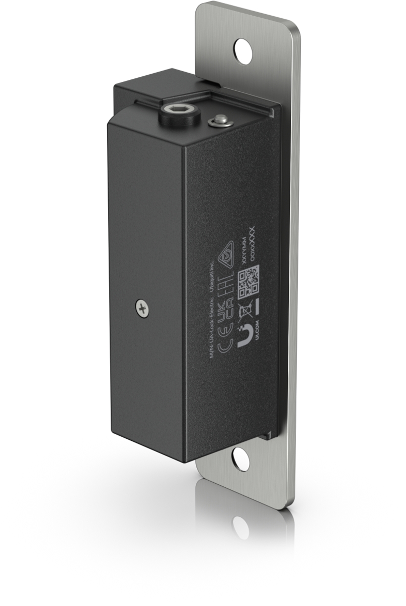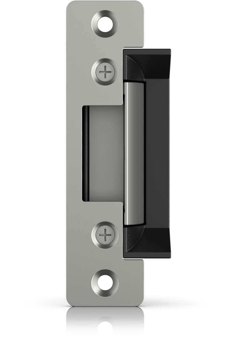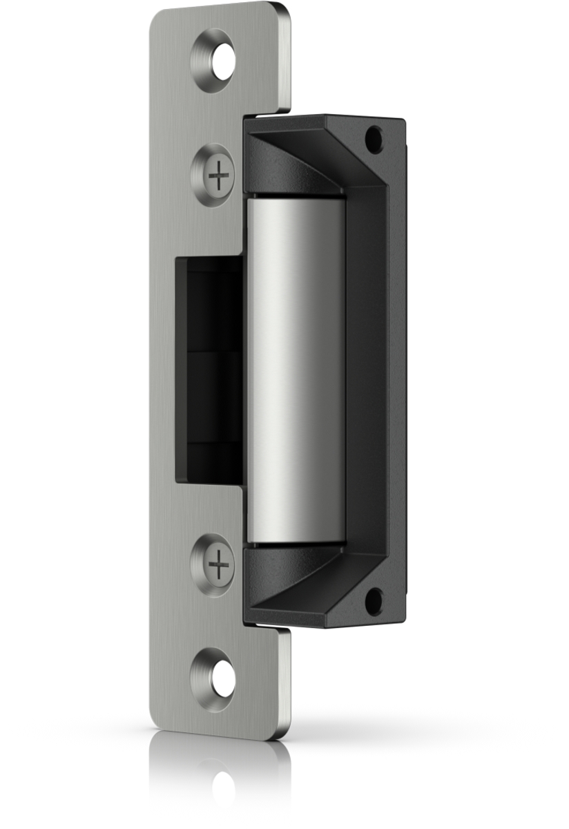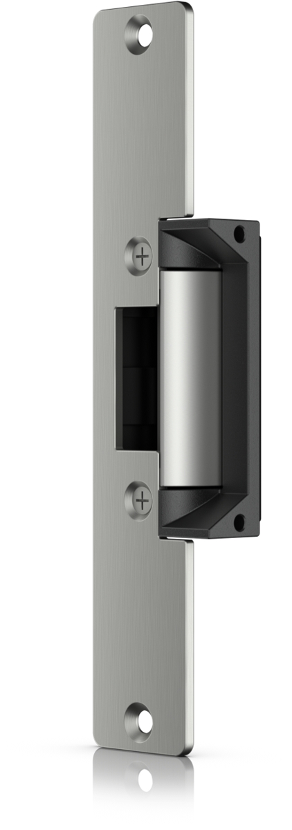 Electric strike lock that connects to a UniFi Access Hub. The lock is fail-secure, remaining locked in the event of failure. It can be installed in wooden, steel, and aluminum frames. Holding force of up to 1200 kg.