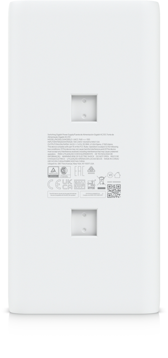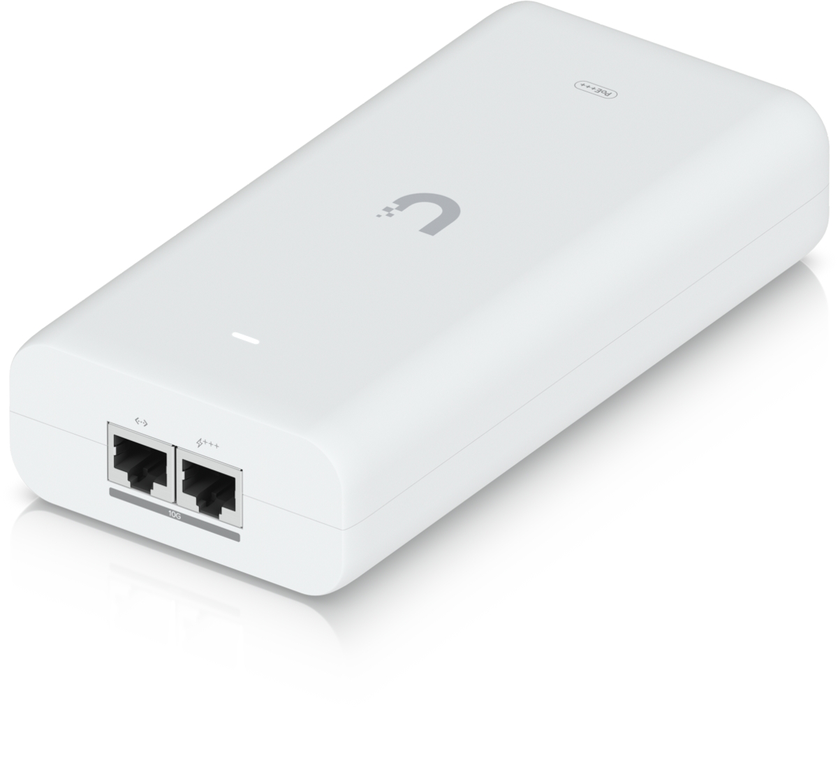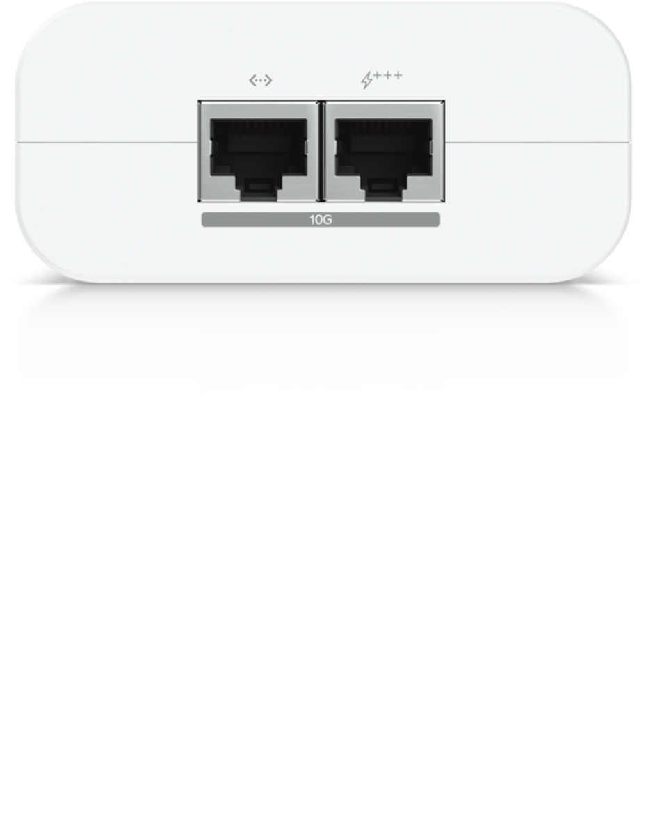 Ubiquiti 10G PoE+++ is a high-quality 10Gbps PoE injector with one PoE output port for powering devices with a voltage of 54V with maximum output power of 90W, which is sufficient for powering energy-intensive devices. Power is conducted on all the wires 1,2,4.5 (+) and 3,6,7.8 (-). The device also includes surge, peak pulse, and overcurrent protection.