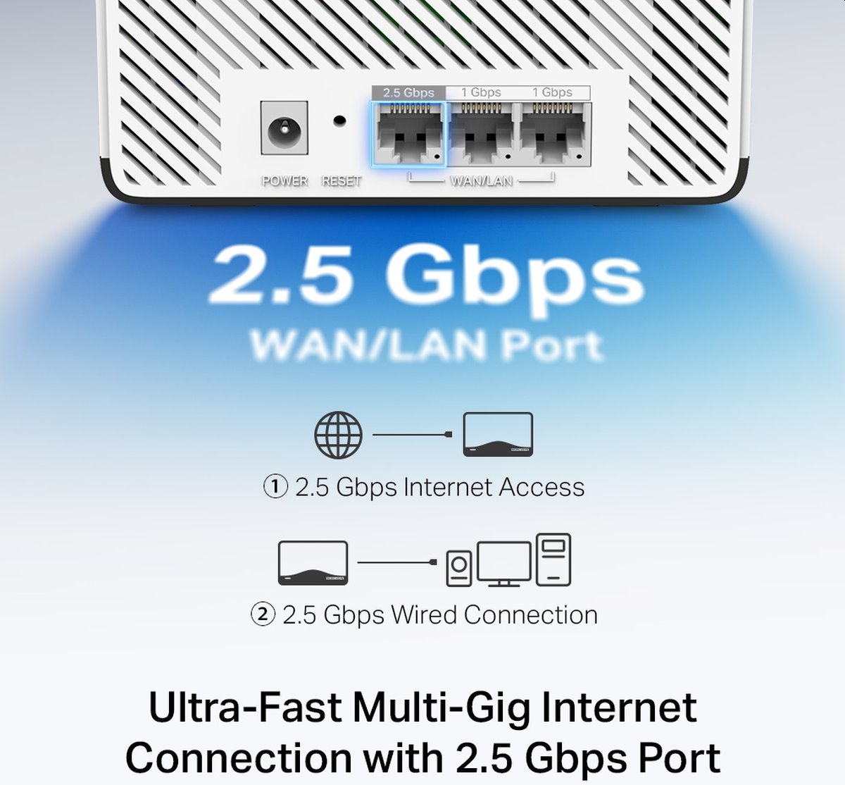 • 2.5G Port: 1× 2.5 Gbps WAN/LAN auto-sensing ports break through the 1G bottleneck, driving your devices to peak performance.