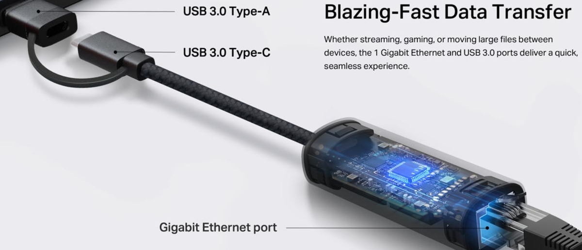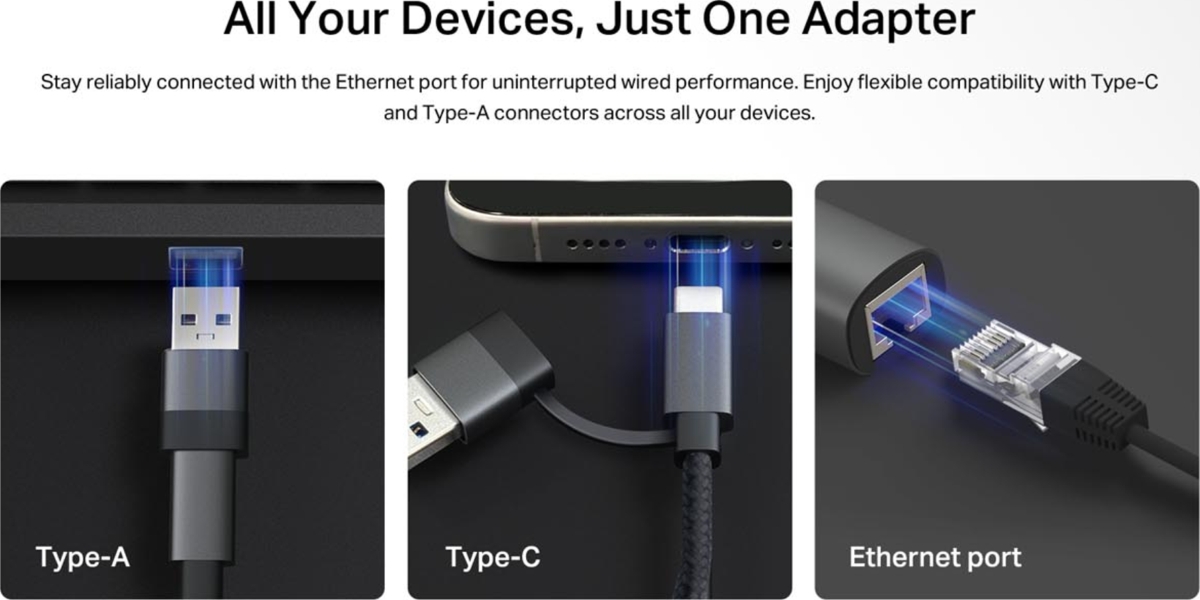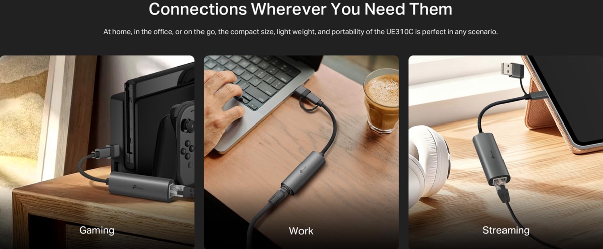 The TP-Link UE310C is an elegant 2.5Gbps USB-C network adapter with an integrated USB-A adapter that equips your computer with a high-speed 2.5G RJ45 port.