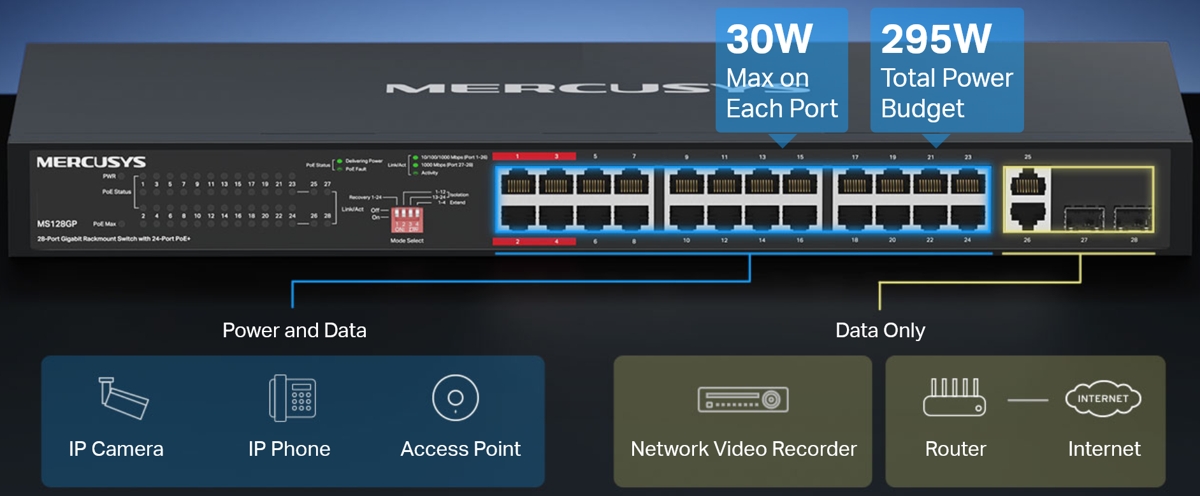 The MERCUSYS MS128GP is an unmanaged Gigabit PoE switch with a switching capacity of 56Gbps, (24) Gbit PoE+ ports, (2) Gbit ports and (2) SFP slots with a total PoE budget of 295W. The maximum device power consumption is 42W (without PoE load).