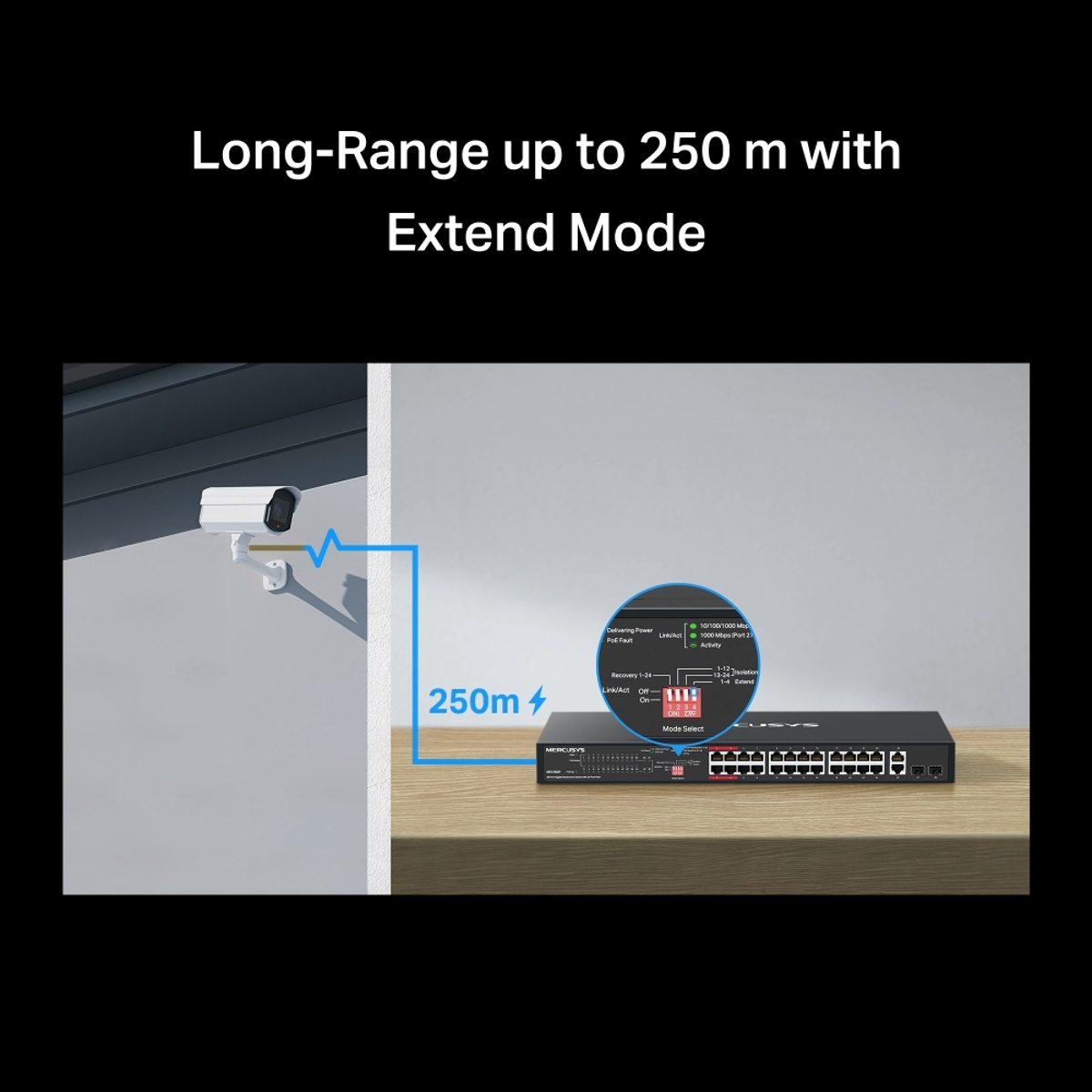 - Extend - increases PoE transmission distance up to 250m at 10Mbps on ports 1-4