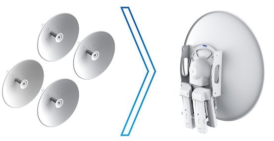 Бързо монтирайте няколко радиостанции airFiber X към съществуващи антени airFiber за инсталация Plug and Play. Можете да използвате радиоканали с различни размери – дори съседни канали без защитна лента – и да ги поставите навсякъде в радиочестотната лента.
