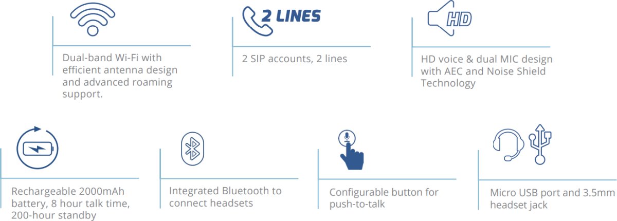 Това е автоматичен превод. Оригиналния текст може да видите тукWP822 е преносим Wi-Fi IP телефон, проектиран да отговаря на различни корпоративни и вертикални пазарни приложения, включително търговия на дребно, логистика, медицина и сигурност. Този бизнес Wi-Fi телефон е оборудван с интегриран двубандов 802.11a/b/g/n/ac Wi-Fi , усъвършенстван дизайн на антената и поддръжка на роуминг. С добавянето на 8 часа време за разговори, HD глас с два микрофона и конфигурируем бутон за разговори, WP822 е оборудван с комбинация от функции, мобилност и издръжливост, за да отговори на всички нужди на преносимата телефония .
