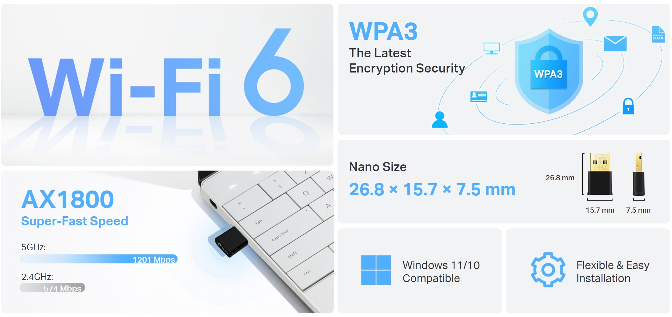 - Лесна настройка : TX20U Nano идва с предварително зареден драйвер. Просто включете и инсталирайте.