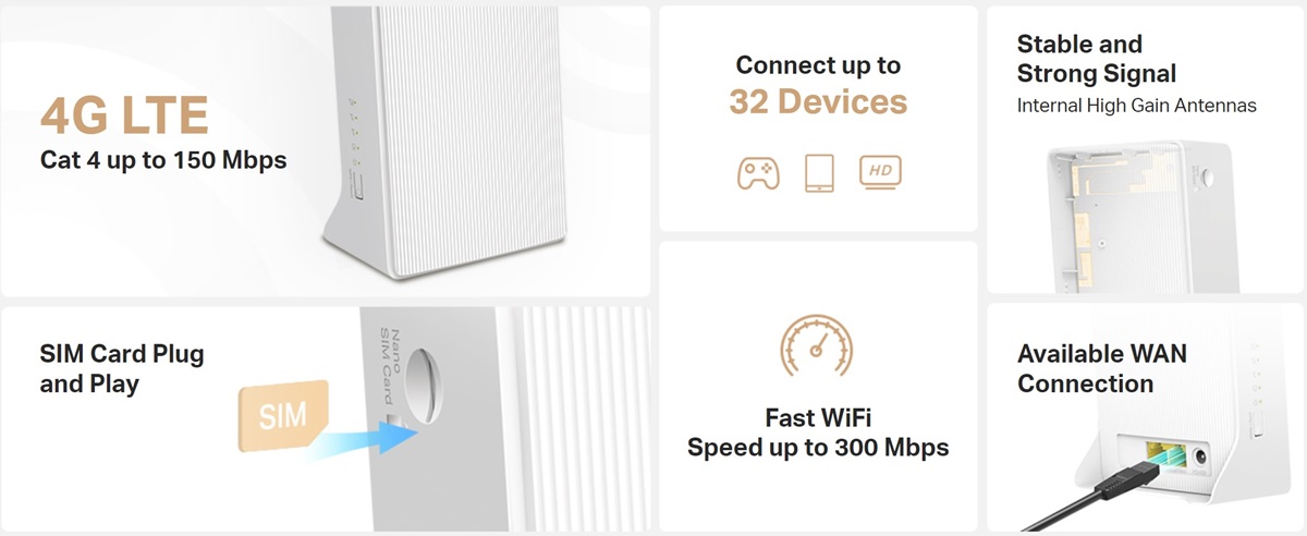 Това е автоматичен превод. Оригиналния текст може да видите тукMB110-4G работи като 4G рутер, използвайки 4G LTE технология за постигане на скорост на изтегляне до 150 Mbps и скорост на качване до 50 Mbps. Можете също така да споделяте Wi-Fi мрежа с максимална скорост от 300 Mbps при 2,4 GHz, идеална за игри, стрийминг и др.