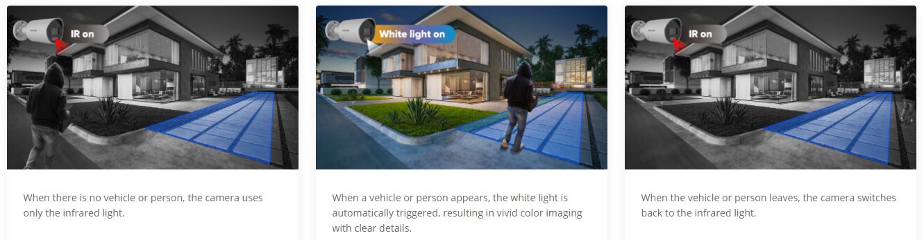Три режима на осветяване предлагат цветно, черно-бяло или цветно гледане, задействано от движение, за да отговарят на почти всяка нужда във всяка среда.