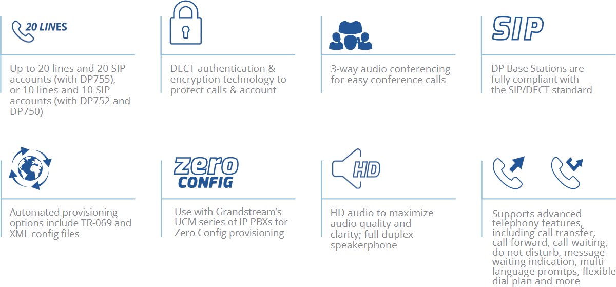 - До 20 линии и 20 SIP акаунта при свързване с базова станция DP755 DECT или до 10 линии и 10 SIP акаунта при свързване с базова станция DP752 или DP750 DECT