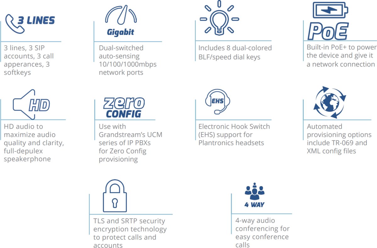Това е автоматичен превод. Оригиналния текст може да видите тукGXP1630 е оборудван с набор от VoIP функции, разположени по ясен и лесен за употреба начин . Фокусиран предимно върху нисък до среден обем на разговори и ефективно обработване на повиквания, неговият дизайн с 3 линии/SIP акаунти и 8 двуцветни бутона BLF/бързо набиране осигуряват тази гъвкавост . GXP1630 поддържа и най-добрите възможни скорости на връзка и качество на разговорите с двойните си гигабитови портове и HD аудио както на високоговорителя, така и на слушалката. С други функции, като интегрираното PoE, 3 програмируеми XML бутона и поддръжка на 4-странна конференция, GXP1630 е висококачествен и универсален базов IP телефон .