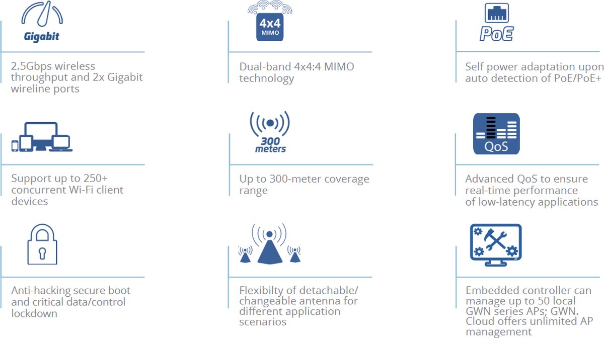 - Вграденият контролер може да управлява до 50 локални точки за достъп от серията GWN; GWN.Cloud предлага неограничено управление на точки за достъп; GWN Manager предлага софтуерен контролер, базиран на място