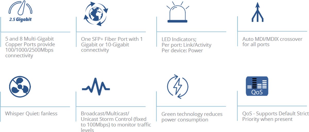 - 5 мултигигабитови медни порта осигуряват 100/1000/2500Mbps свързаност