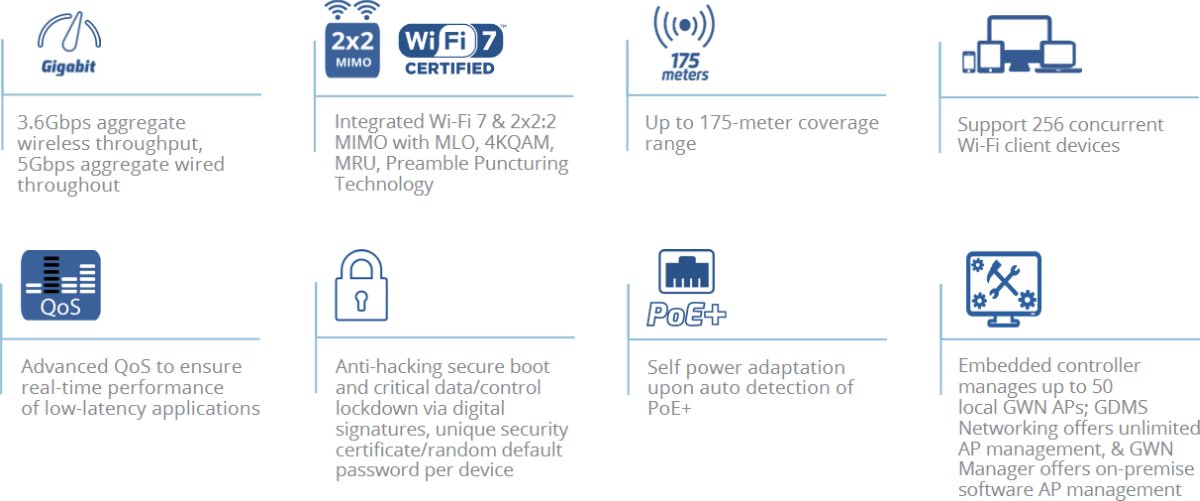 - Вграденият контролер управлява до 50 локални GWN точки за достъп; GDMS Networking предлага неограничено управление на точки за достъп, а GWN Manager предлага локално софтуерно управление на точки за достъп.
