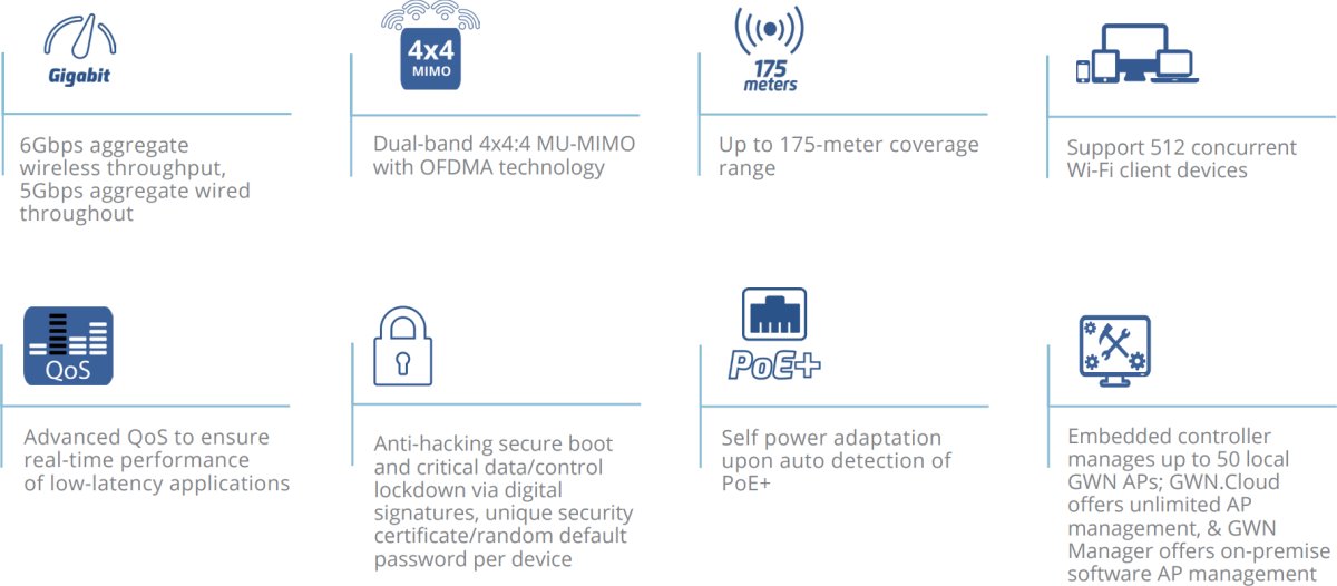 - Вграденият контролер управлява до 50 локални GWN точки за достъп; GDMS Networking предлага неограничено управление на точки за достъп, а GWN Manager предлага локално софтуерно управление на точки за достъп.