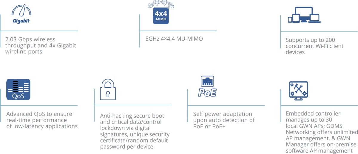 - Вграденият контролер може да управлява до 30 локални точки за достъп от серията GWN