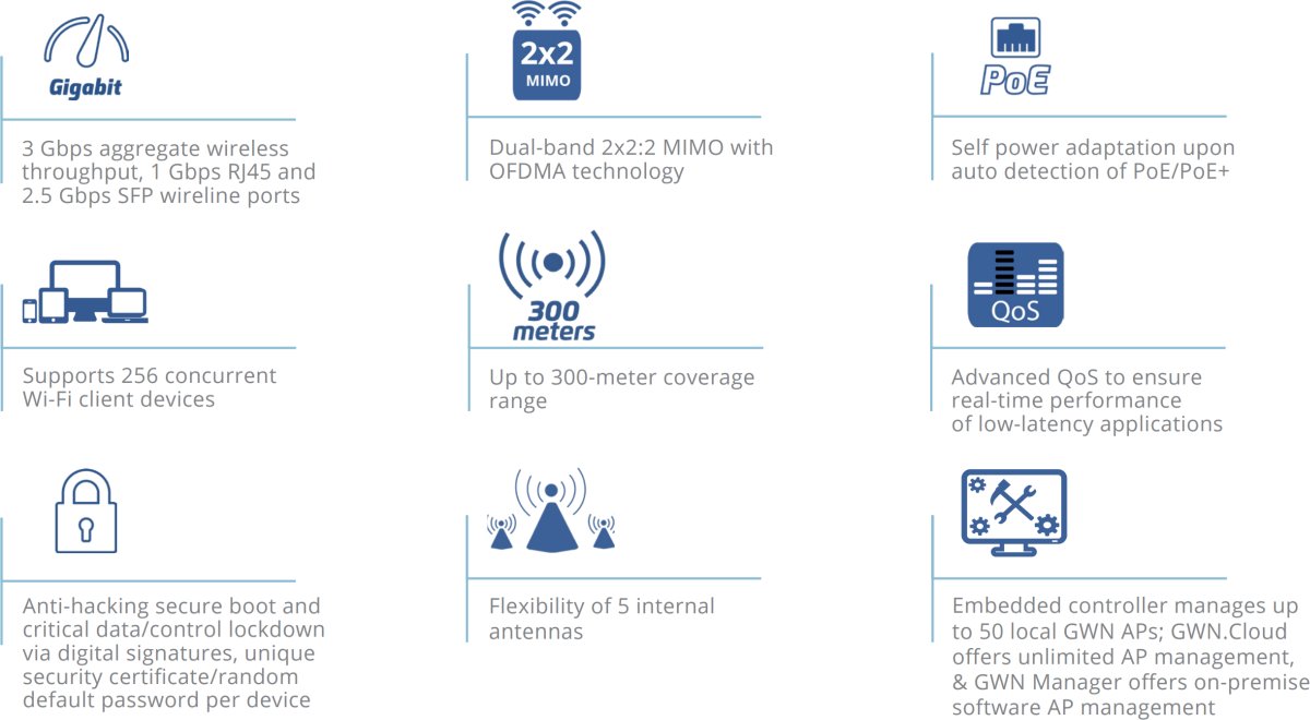- Вграденият контролер управлява до 50 локални GWN точки за достъп; GDMS Networking предлага неограничено управление на точки за достъп, а GWN Manager предлага локално софтуерно управление на точки за достъп.