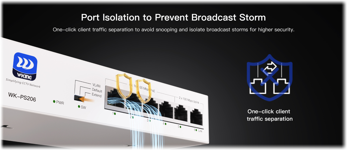 В режим VLAN, отделните PoE портове са изолирани и могат да комуникират само с uplink портовете. Това предотвратява ненужния broadcast трафик между устройствата, защитавайки мрежата от така наречените „broadcast storms“ и подобрявайки надеждността и сигурността на данните.