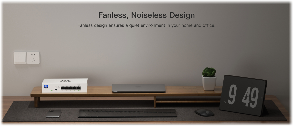 Благодарение на пасивното охлаждане без вентилатор, комутаторът е напълно безшумен. Подходящ е не само за монтаж в стелажи, но и за поставяне директно на бюро в офис, рецепция или малък бизнес.