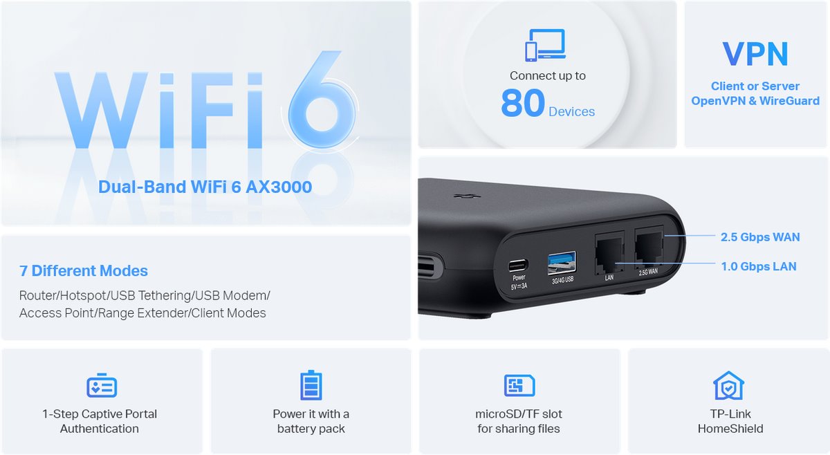 - Преносим и издръжлив дизайн: TL-WR3002X е джобен рутер, компактно проектиран за вашето следващо пътуване или приключение. Малкият му размер е предназначен за удобно съхранение по време на пътуване.