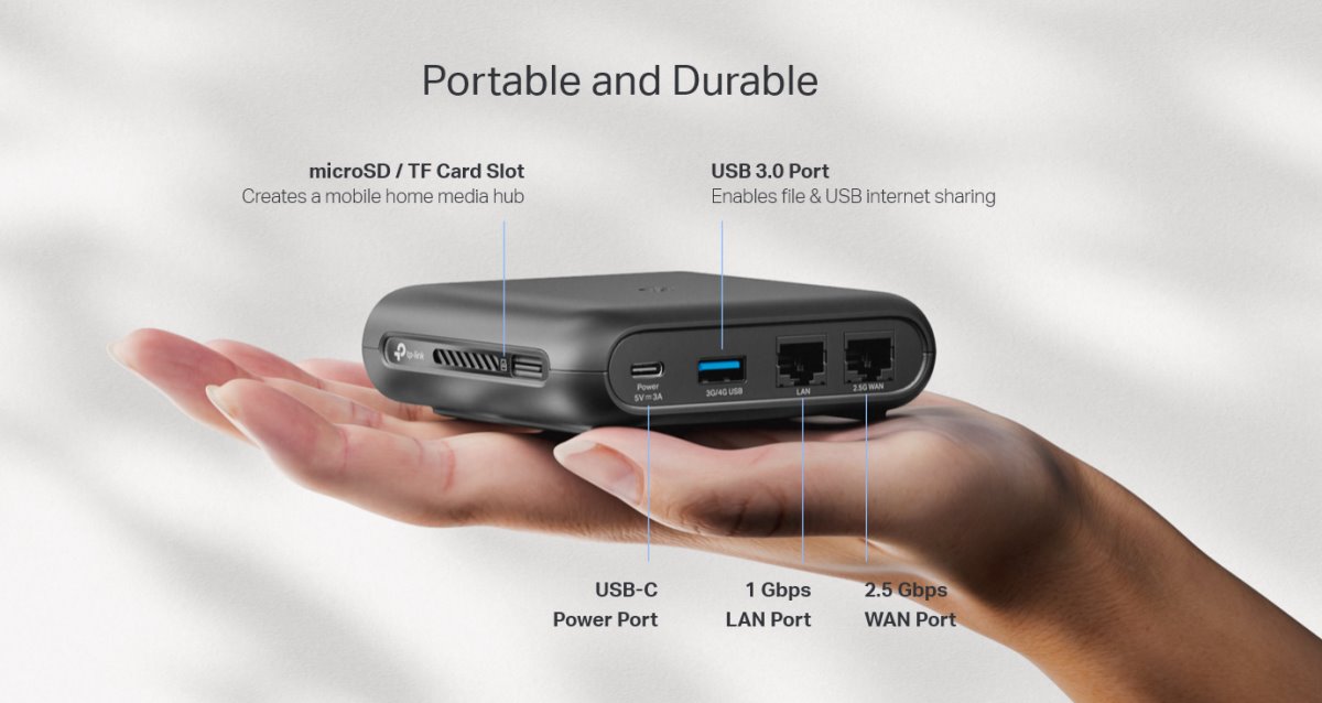 - Захранвайте го с външна батерия: С интерфейс Type-C можете гъвкаво да го превърнете в мобилен рутер с външна батерия.