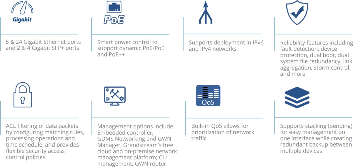 - Опциите за управление включват: Вграден контролер; GDMS Networking и GWN Manager, безплатната платформа за управление на мрежата в облака и локално на Grandstream; CLI управление; GWN рутер