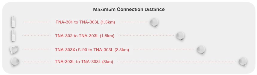 Устройството TNA-303L-65 е оборудвано с гигабитов Ethernet порт, поддържащ PoE-IN 38–57V , с максимална консумация на енергия от 15 W. Разполага и с USB-A порт за свързване на 2.4 GHz Wi-Fi адаптер, което опростява инсталирането и подравняването на устройството.