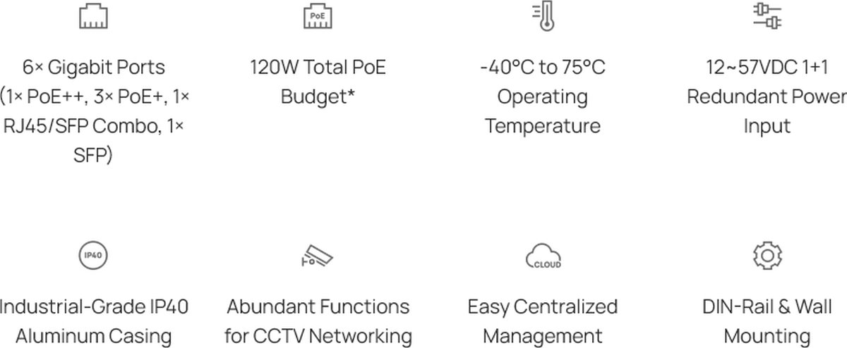 - Професионален дизайн от индустриален клас: работна температура -40~75°C, мълниезащита 6kV и 1+1 резервен захранващ вход