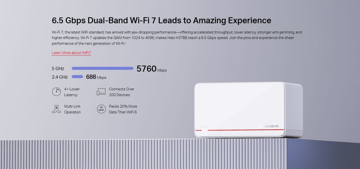 - Най-новият Wi-Fi 7: Въоръжена със 160 MHz канали, 4K-QAM, MLO и други функции, предлагани от Wi-Fi 7, вашата мрежа ще ви осигури зашеметяваща производителност.