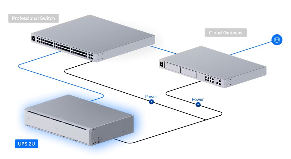 Ubiquiti UniFi UPS 2 U е резервно захранващо устройство, предназначено за мрежови устройства, осигуряващо тяхната работа по време на прекъсване на захранването. Устройството е с монтаж в шкаф "2 U" и включва 8 захранващи гнезда за свързване на оборудване. От тях 4 гнезда (C13) осигуряват защита от пренапрежение, докато останалите 4 гнезда (C13) предлагат комбинирана защита - както от пренапрежение, така и от прекъсване на захранването . Непрекъснатото захранване се осигурява от (2) сменяеми батерии с функция за гореща смяна , които позволяват подмяна на батериите, докато устройството остава работещо, без да е необходимо да се изключва захранването. Това гарантира, че свързаните устройства остават непрекъснато захранвани дори по време на поддръжка или подмяна на батерии.