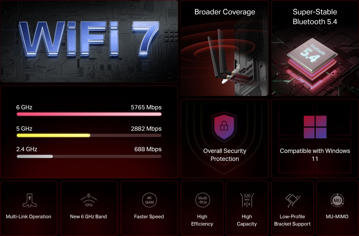 Това е автоматичен превод. Оригиналния текст може да видите тукMERCUSYS MA47BE оборудва вашия компютър с Wi-Fi 7 технология и 6 GHz лента , което ви позволява да използвате пълноценно потенциала на вашия Wi-Fi 7 рутер. С високоскоростна трибандова Wi-Fi мрежа, той може да се справи с всички ваши онлайн дейности с лекота, от стрийминг на HD видеоклипове до игри и сърфиране в интернет. В допълнение, той разполага с Bluetooth 5.4 технология за по-бързи и по-стабилни връзки с периферни устройства като слушалки, клавиатури и игрови контролери.