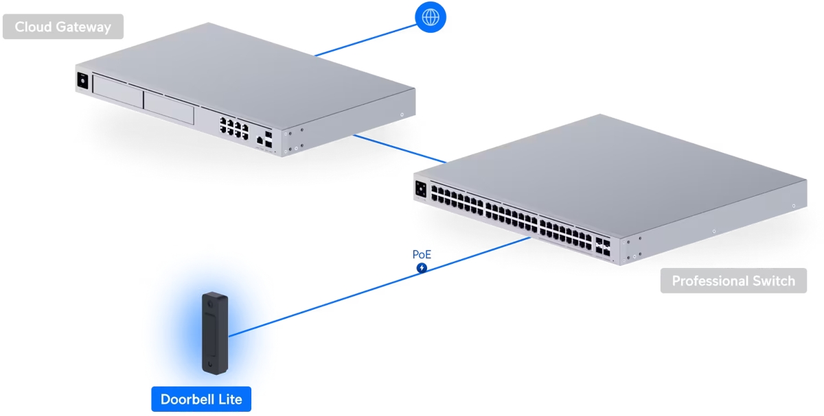 Това е автоматичен превод. Оригиналния текст може да видите тукUbiquiti Doorbell Lite е компактен видео звънец UniFi Protect с 5MP камера , зрително поле от 95.8°, IR осветление за нощно виждане до 5 м , устойчив на атмосферни влияния корпус , вграден микрофон и високоговорител за двупосочна аудио комуникация . Захранването и мрежовата свързаност се осигуряват чрез (1) 10/100Mbps PoE-In порт за свързване към UniFi Protect система.