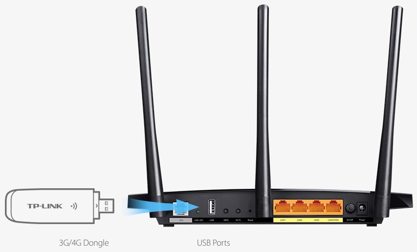 С множество входове, Archer VR400 ви предоставя различни опции при свързване към интернет. Като резервно копие, портът EWAN позволява на Archer VR400 да приема връзки от кабелни и оптични модеми чрез Ethernet кабел. Освен това USB портът поддържа 3G/4G връзки с ключ.