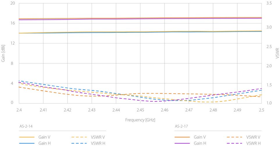 Усилването на антените Array Sector остава много стабилно в ултра-широк диапазон от честоти 2400 - 2484 MHz. Стойностите на VSWR са отлични в целия полезен спектър за максимална мощност, доставена от радио към антената.