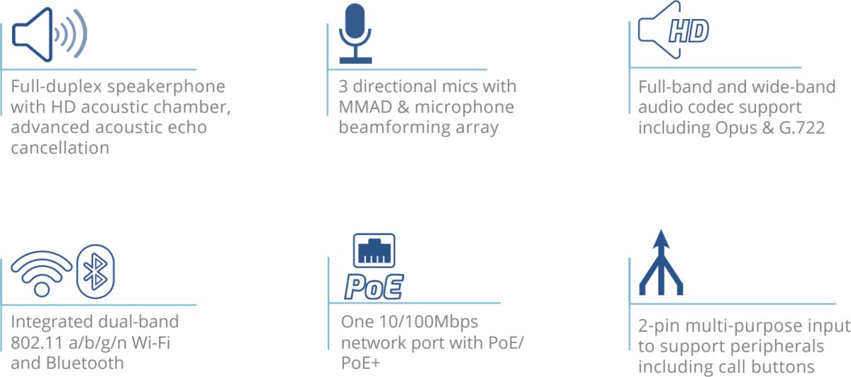 - Full-duplex speakerphone with HD acoustic chamber, advanced acoustic echo cancellation