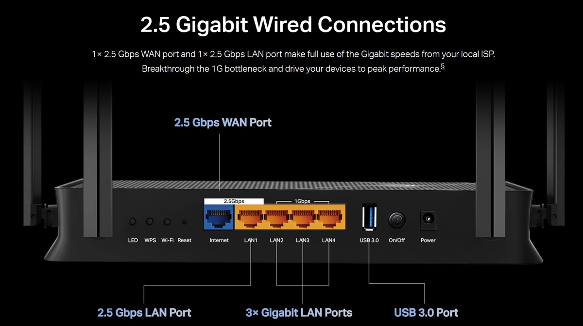 - 2× 2.5G Ports: 1× 2.5 Gbps WAN port, 1× 2.5 Gbps LAN port, and 3× 1 Gbps LAN ports ensure high-speed data transmission.