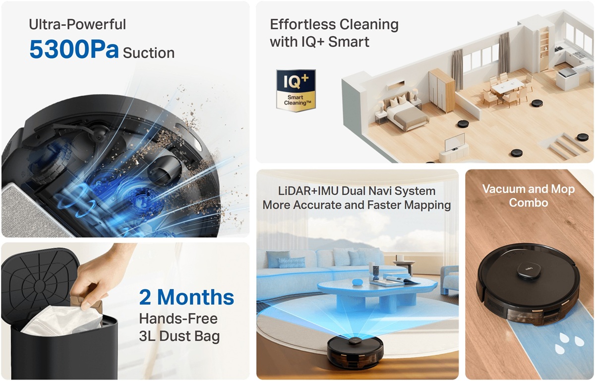 The LiDAR & IMU Dual Navigation system maps every room in real-time with a 360° field of view, enhancing cleaning efficiency and preventing collisions with furniture or falls.