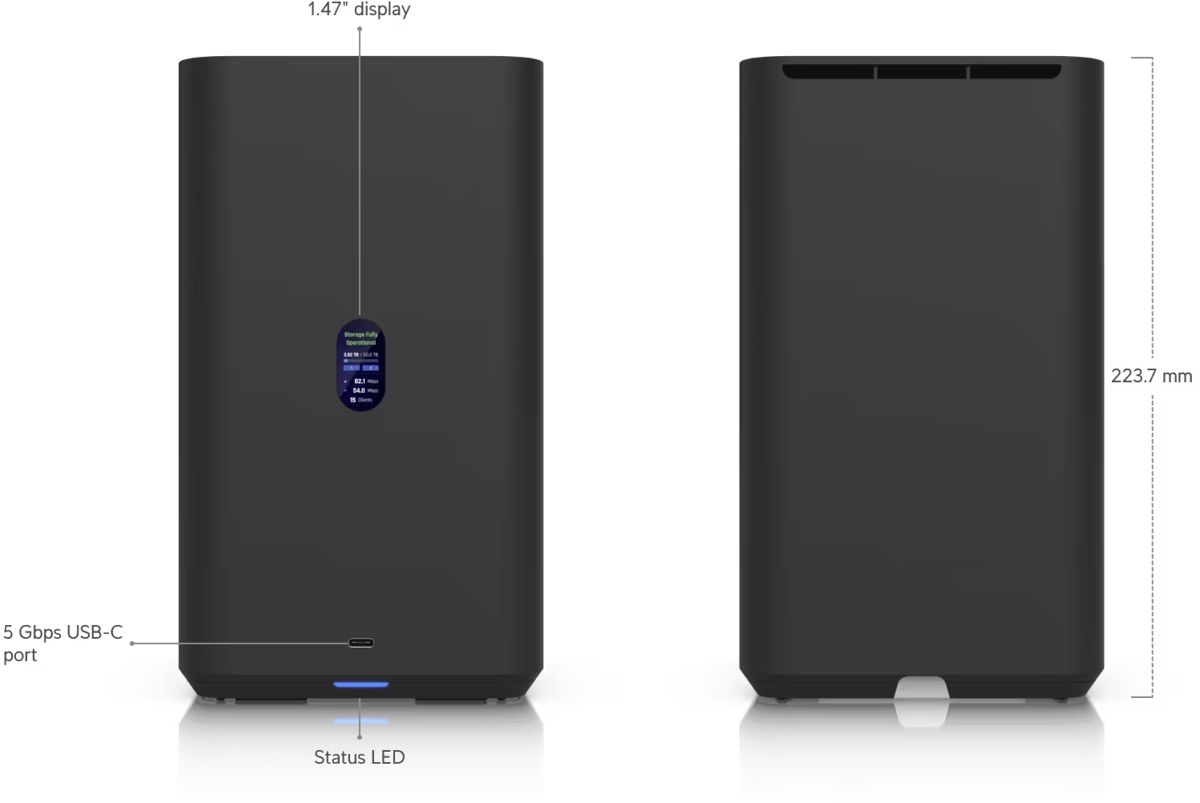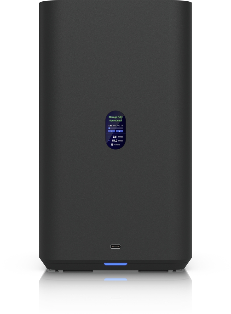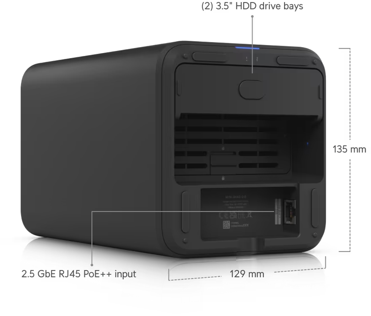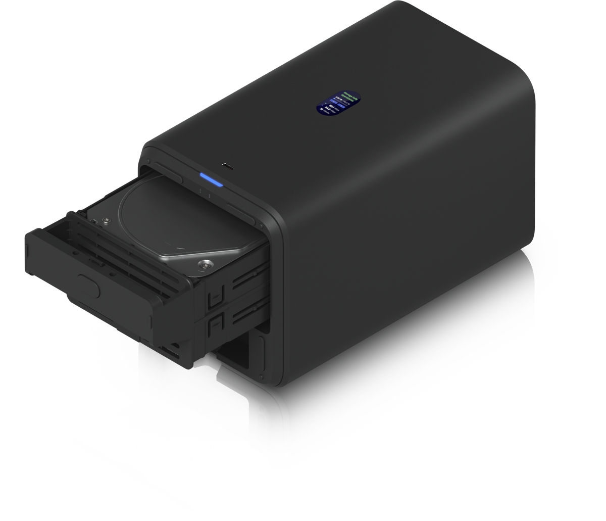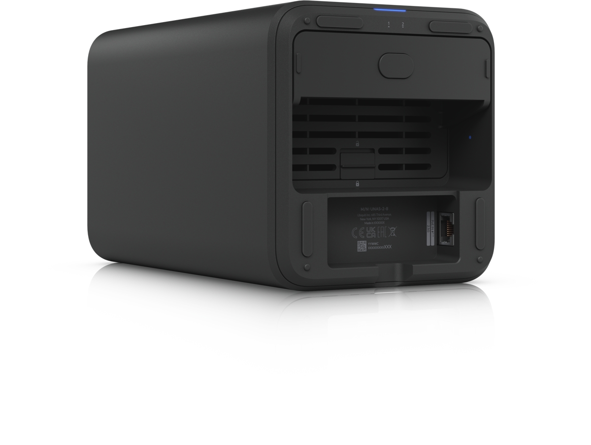 UniFi Network Attached Storage with (2) 3.5" HDD bays, 2.5 GbE RJ-45 networking, USB-C connectivity, and an included PoE++ adapter, all in a compact footprint. Powered by a quad-core ARM Cortex-A55 processor, complemented by 4 GB of RAM.
