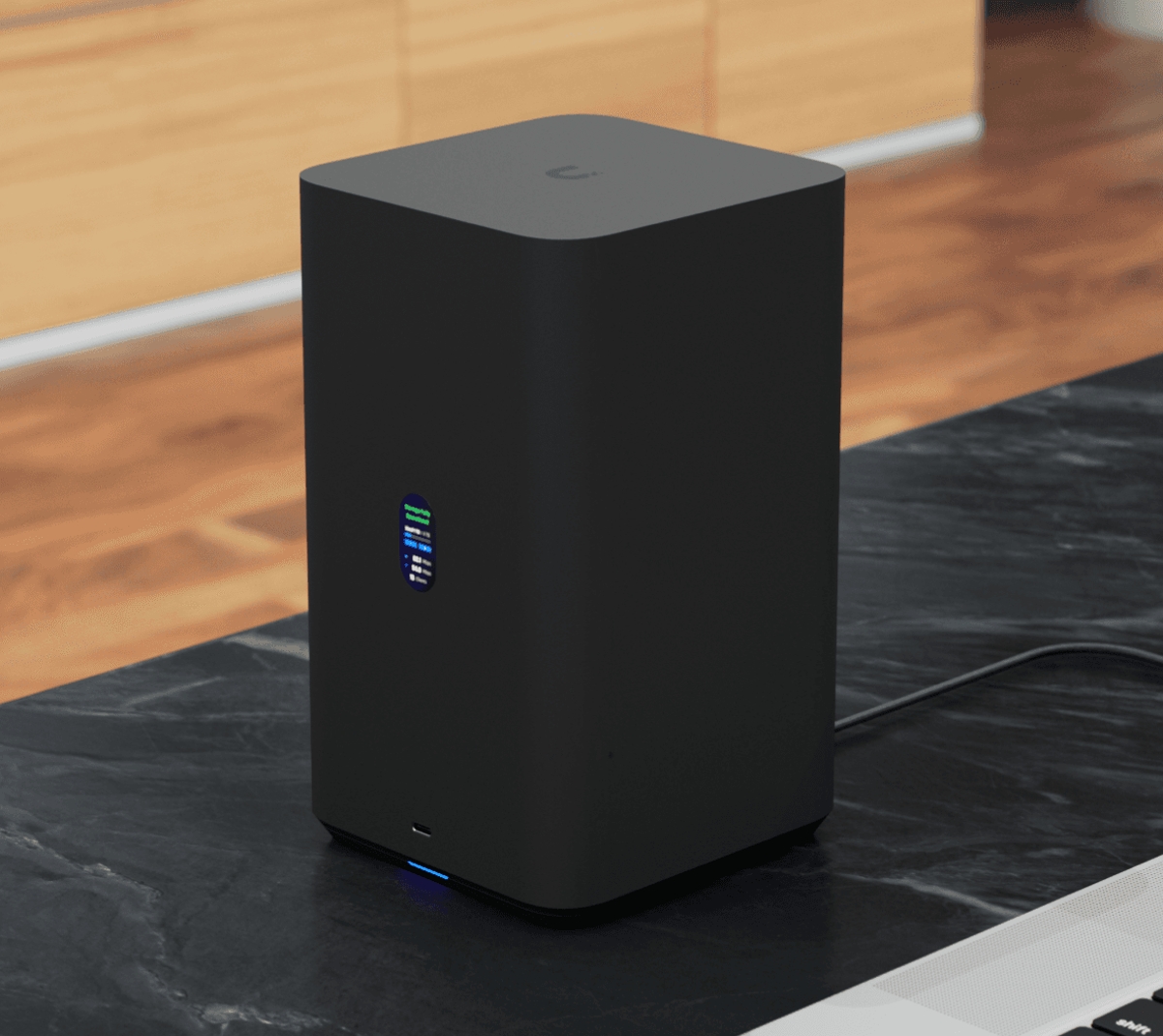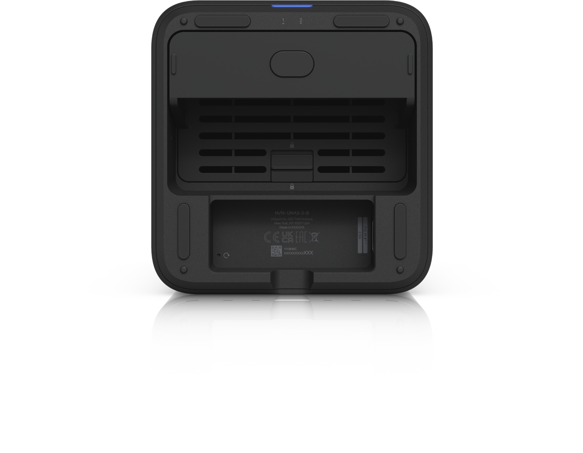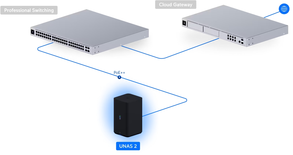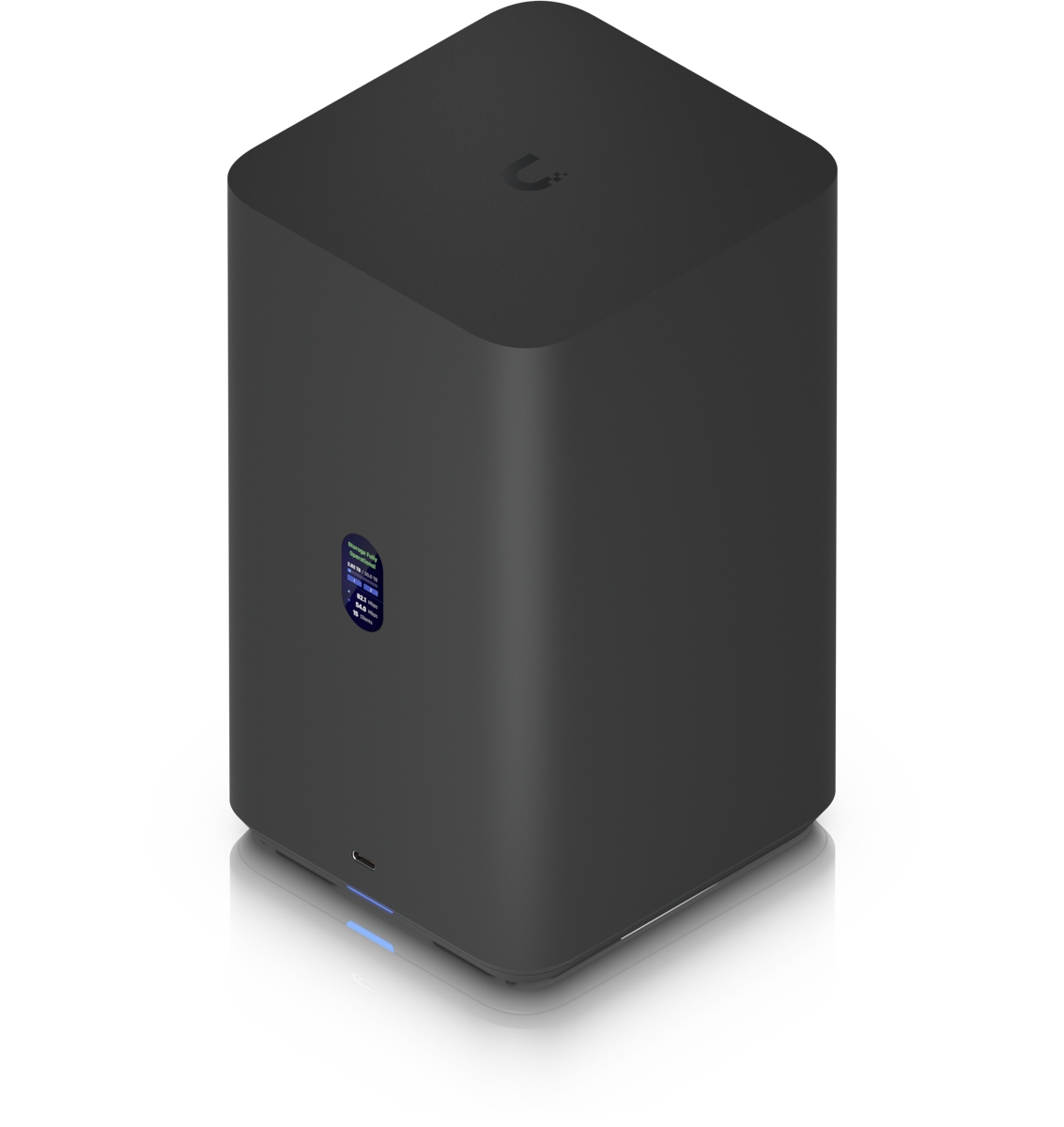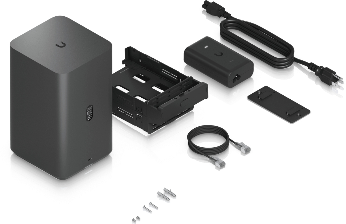 UniFi Network Attached Storage with (2) 3.5" HDD bays, 2.5 GbE RJ-45 networking, USB-C connectivity, and an included PoE++ adapter, all in a compact footprint. Powered by a quad-core ARM Cortex-A55 processor, complemented by 4 GB of RAM.
