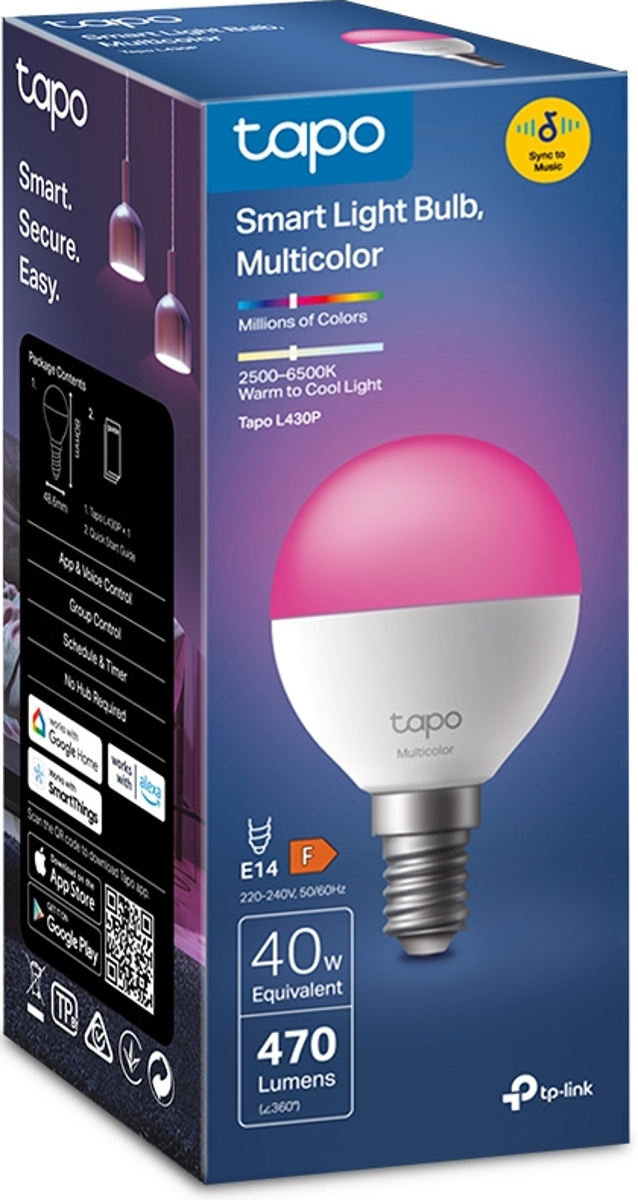 Tapo L430P is a smart multicolor dimmable bulb with color temperature ranging from 2500K to 6500K using the E14 socket with a consumption of 4.8W and brightness of 470 lumens (equivalent incandescent lamp power of 40W).