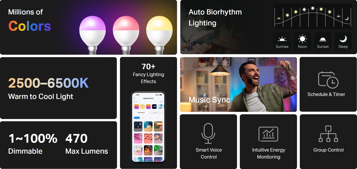 Simply connect your smart bulb to your home Wi-Fi network and control with Tapo wherever you go. You do not need any additional hubs. The bulb also supports Amazon Alexa voice control and Google Assistant. It can be dimmed and turned on manually or based on adjustable schedules.