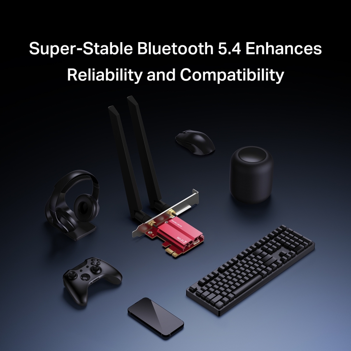 The MERCUSYS MA47BE equips your computer with Wi-Fi 7 technology and the 6 GHz band, allowing you to fully utilize the potential of your Wi-Fi 7 router. With high-speed Tri-band Wi-Fi, it can handle all your online activities with ease, from streaming HD videos to gaming and browsing the web. In addition, it features Bluetooth 5.4 technology for faster and more stable connections to peripherals such as headphones, keyboards, and game controllers.