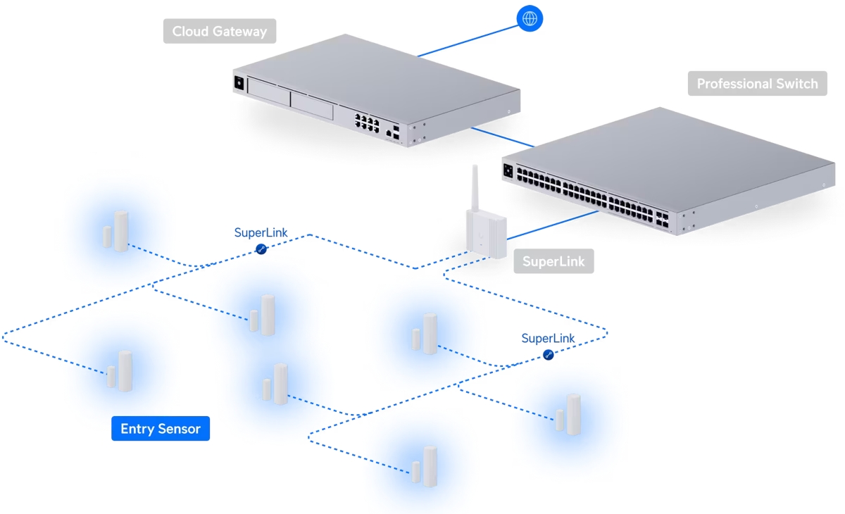 The Ubiquiti USL-Entry is a wireless UniFi Protect sensor designed to monitor the open/closed status of doors and windows. It communicates with the gateway using the proprietary SuperLink protocol with range of up to 2km (in open space). Both the sensor and the magnet can be easily attached using adhesive or screws to walls, doors or windows. The sensor is powered by a CR123A battery (included) with battery life of up to 6 years.