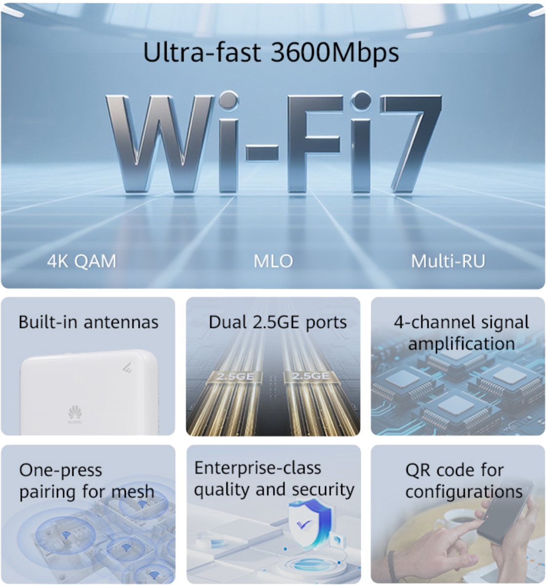The Huawei eKitOptiX FG736 is a wireless dual-band Wi-Fi 7 router that is perfectly suited for combination with ONT units in bridge mode. It works simultaneously in the 2.4GHz and 5GHz bands, delivering a maximum total throughput of up to 3.57Gbps and is equipped with (2) 2.5G LAN/WAN ports and (2) 1Gbit LAN/WAN ports. The router is Mesh-compatible and can be wirelessly paired with other Huawei products to create a complete home network with a single SSID, allowing seamless roaming.