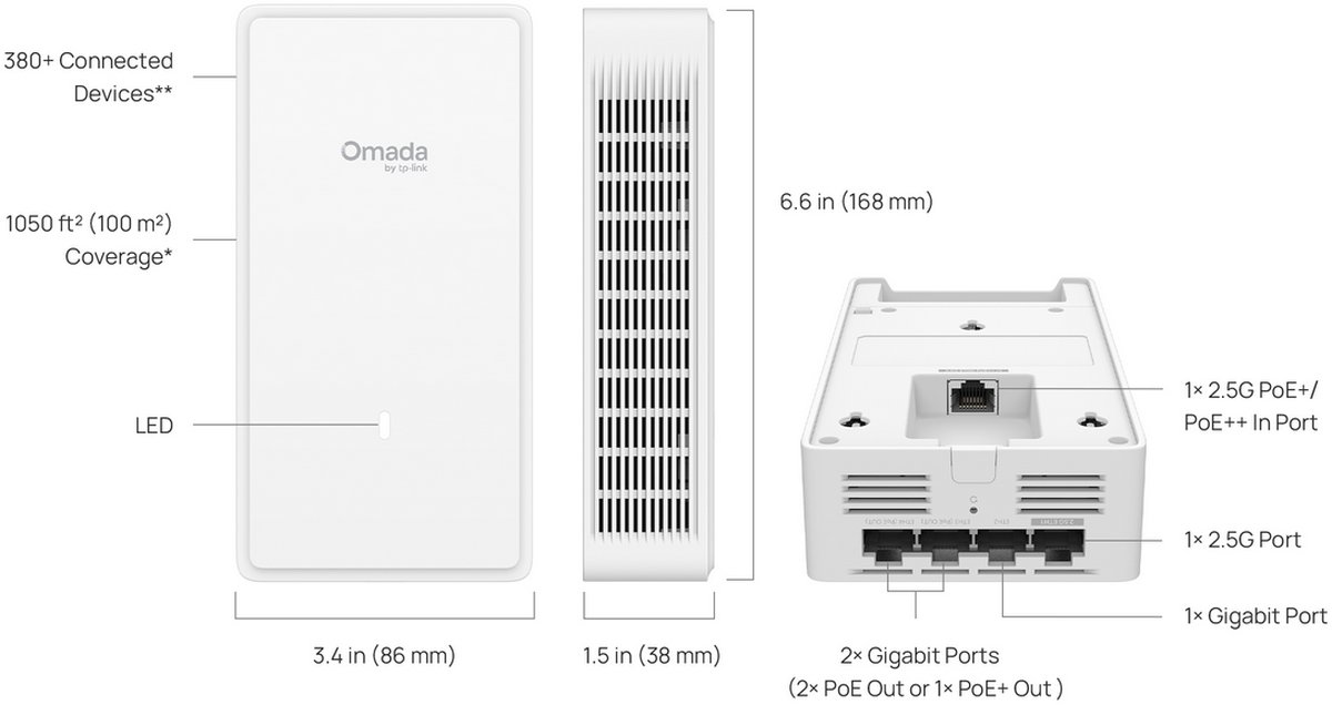 - (2) 2.5G ports (1× PoE+/PoE++ In) + (3) Gigabit ports (2× PoE Out or 1× PoE+ Out).