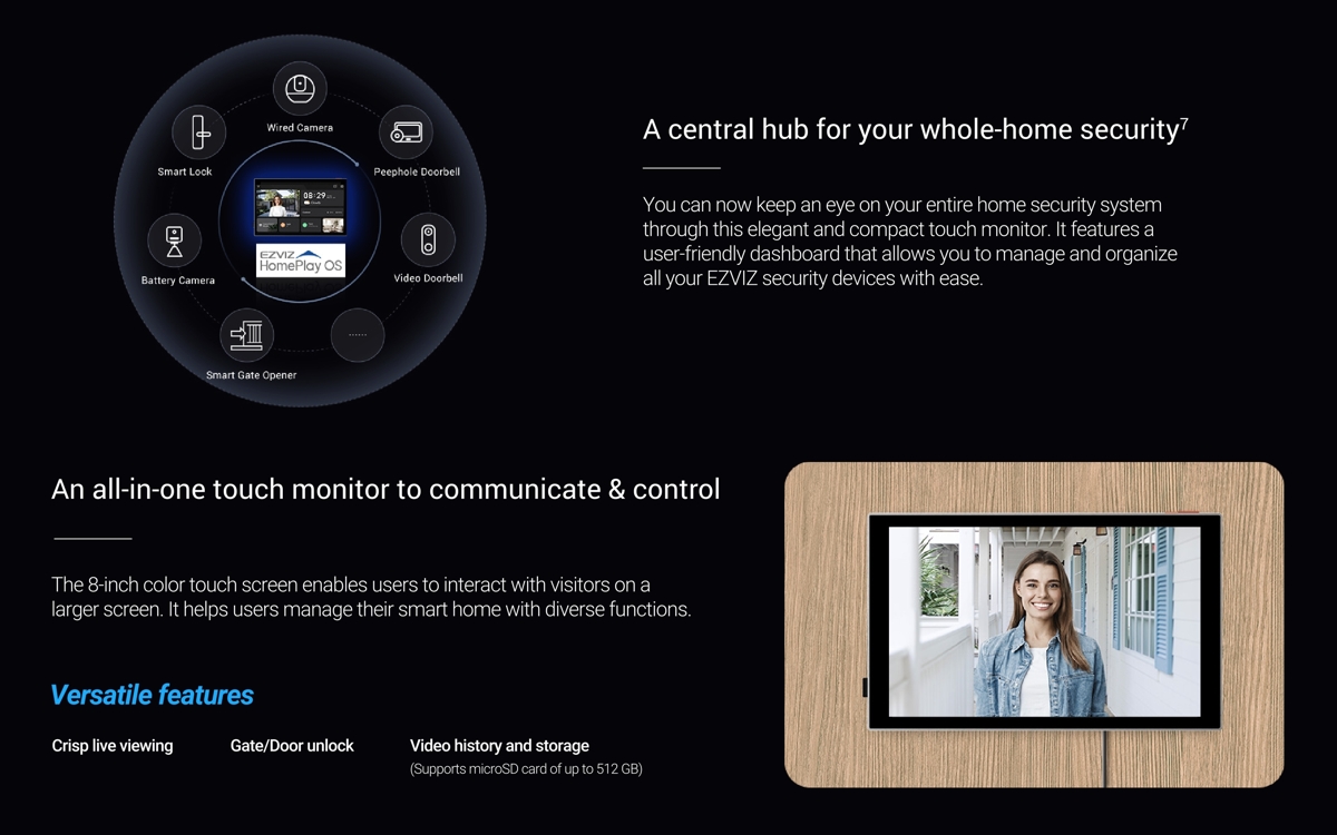 - 8" touchscreen monitor with a resolution of 1280 × 800 px, allowing you to view and communicate with visitors at the door and control the door lock. It supports Dual-Band Wi-Fi 6 connectivity and video storage via a microSD card slot up to 512 GB.