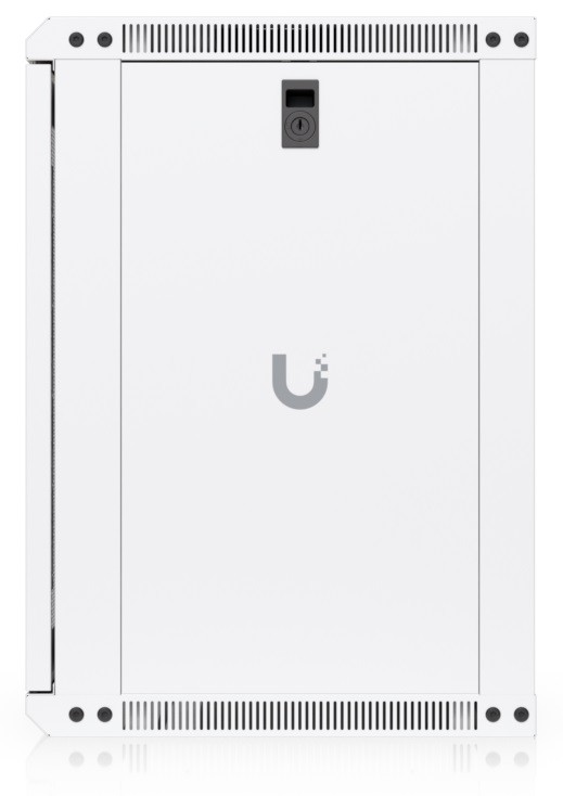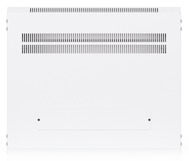 To ensure efficient cooling of active components, the rack cabinet is equipped with a pair of fans, keeping total noise levels below 50 dB(A). If you need to back up active devices using, for example, batteries, you will appreciate its above-standard load capacity of 50 kg. The enclosure features an elegant white finish with a powder-coated surface, and the Ubiquiti logo is present on the side panels. Cable entry points covered with blanking plates are available on the bottom, top, and rear sides of the rack cabinet.