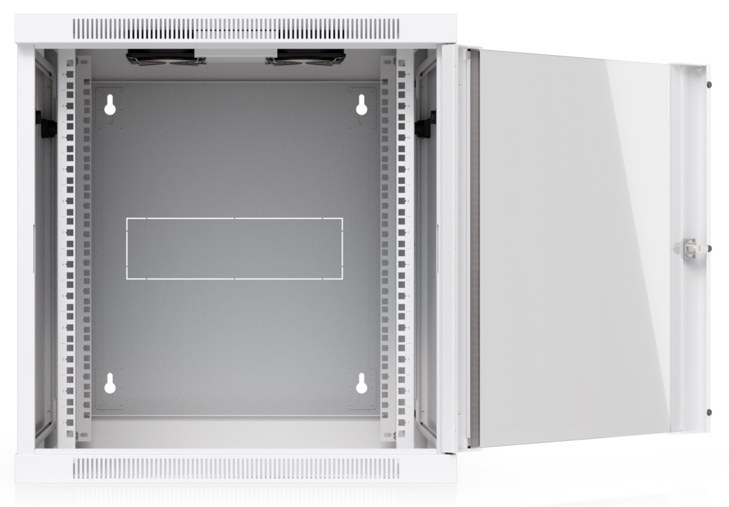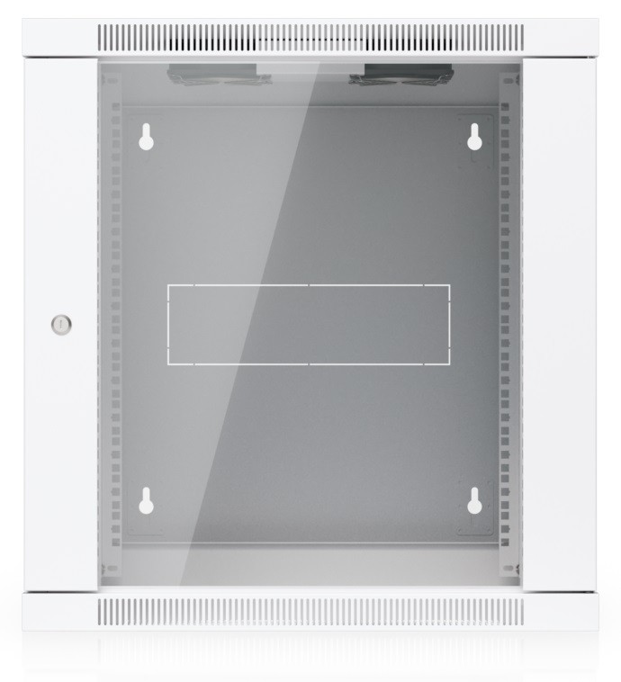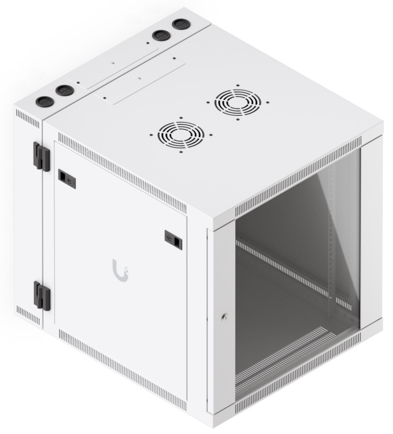 Ubiquiti UACC-Rack-12U-Wall-SW-G is a two-section 19" wall-mounted rack in 12U size, delivered fully assembled and equipped with a glass front door panel, which — just like the removable side panels — can be locked to prevent unauthorized access. The door is factory-set to a left-hand orientation with the option to reverse it. With a depth of 700 mm, the rack allows the installation of networking devices up to 559 mm deep.
