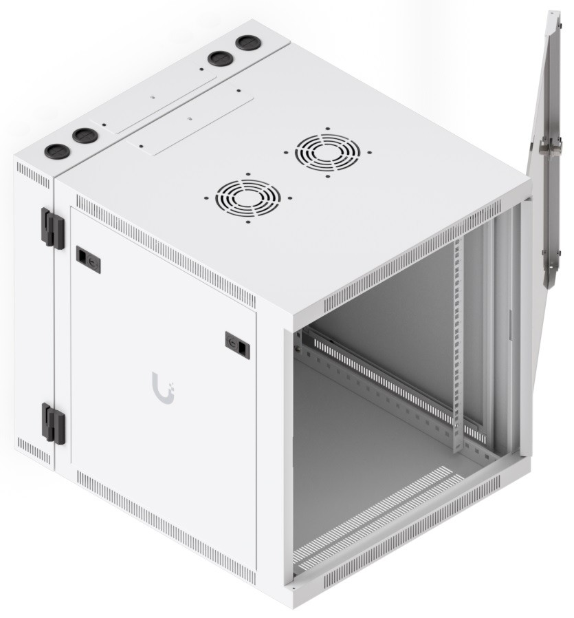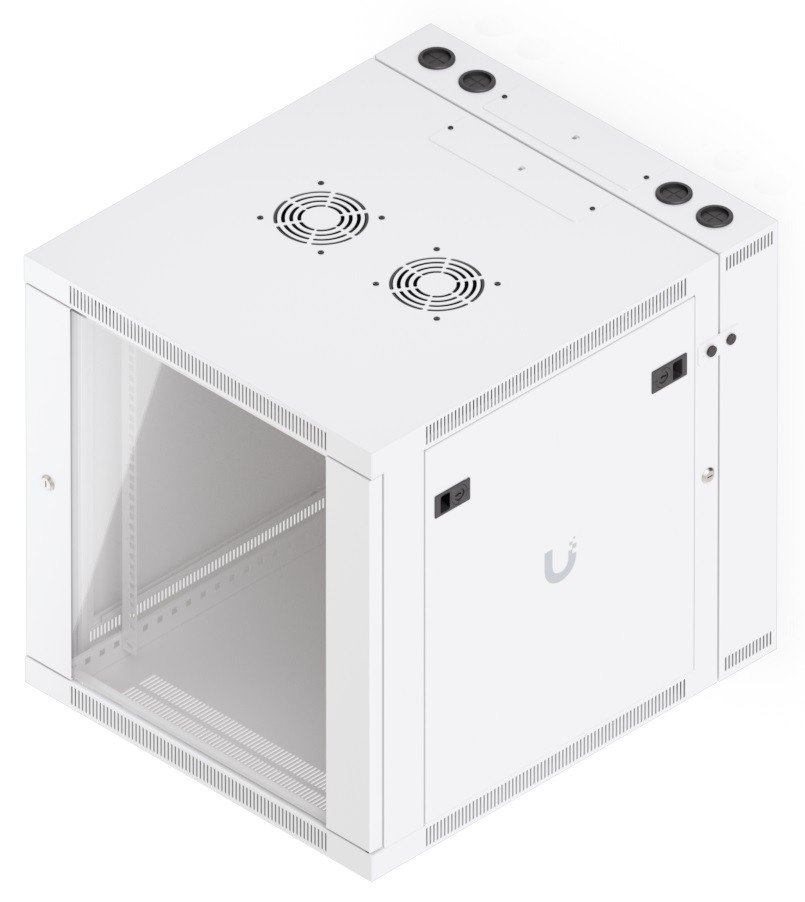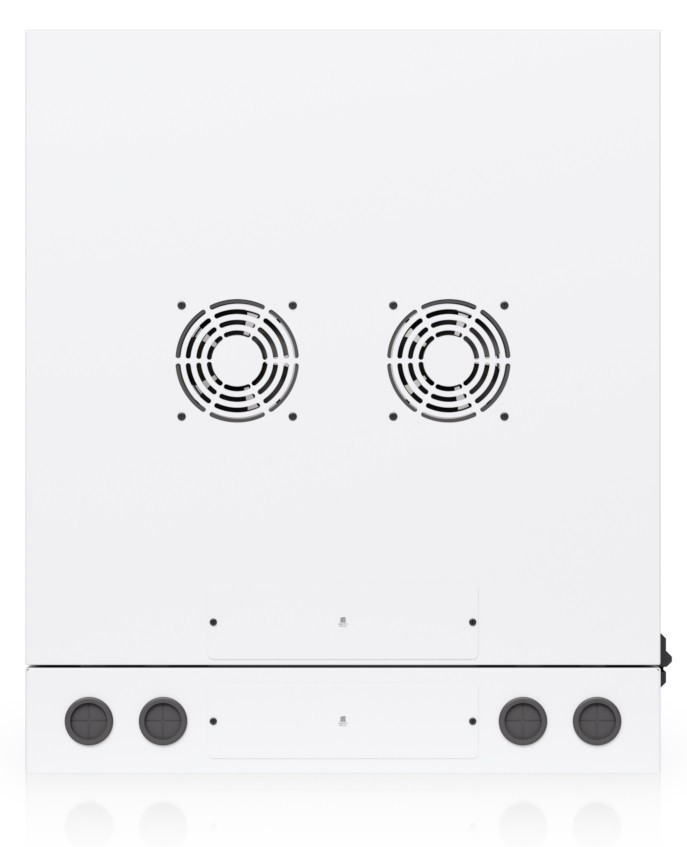 To ensure efficient cooling of active components, the rack is equipped with a pair of fans, keeping total noise levels below 50 dB(A). If you need to back up active devices using, for example, batteries, you will appreciate its above-standard load capacity of 80 kg. The enclosure features an elegant white finish with a powder-coated surface, and the Ubiquiti logo is present on the side panels. Cable entry points covered with blanking plates are available on the bottom, top, and rear sides of the rack.