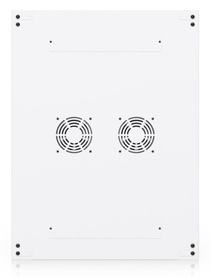 To ensure efficient cooling of active components, the rack is equipped with four fans. The static load capacity is 800 kg, and the rolling load capacity is up to 320 kg. The enclosure features an elegant white finish with a powder-coated surface, and the Ubiquiti logo is present on the side panels. Cable entry points covered with blanking plates are available on the bottom, top, and rear sides of the rack.